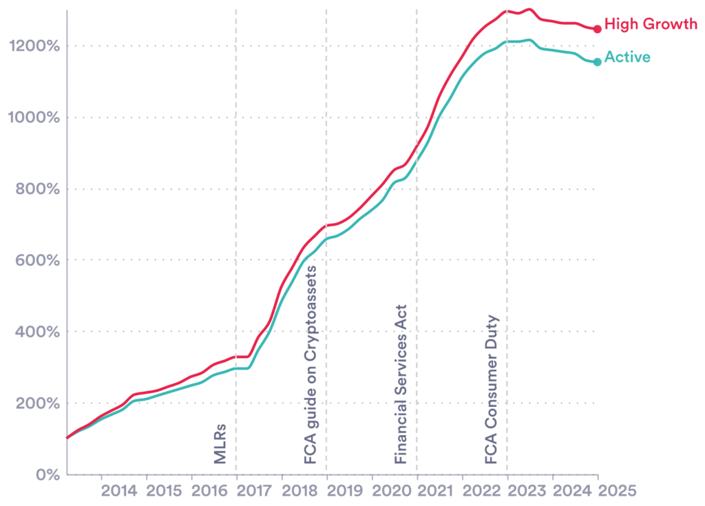 Figure 1: Change in the number of ‘active’ and ‘high growth’ cryptocurrency companies, 2013- 2025