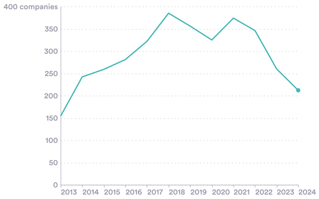 Beauhurst’s analysis shows FinTech company growth plateauing after the duty came into force. For the first time in a decade, exits outpaced new company formations. Equity fundraising also fell back to levels last seen in 2017, after peaking immediately prior to the introduction of the legislation. As shown in Figure 3, early-stage activity has been particularly hit: first-round fundraising events dropped from over 350 in 2021 to just above 200 in 2024 – the lowest in a decade.